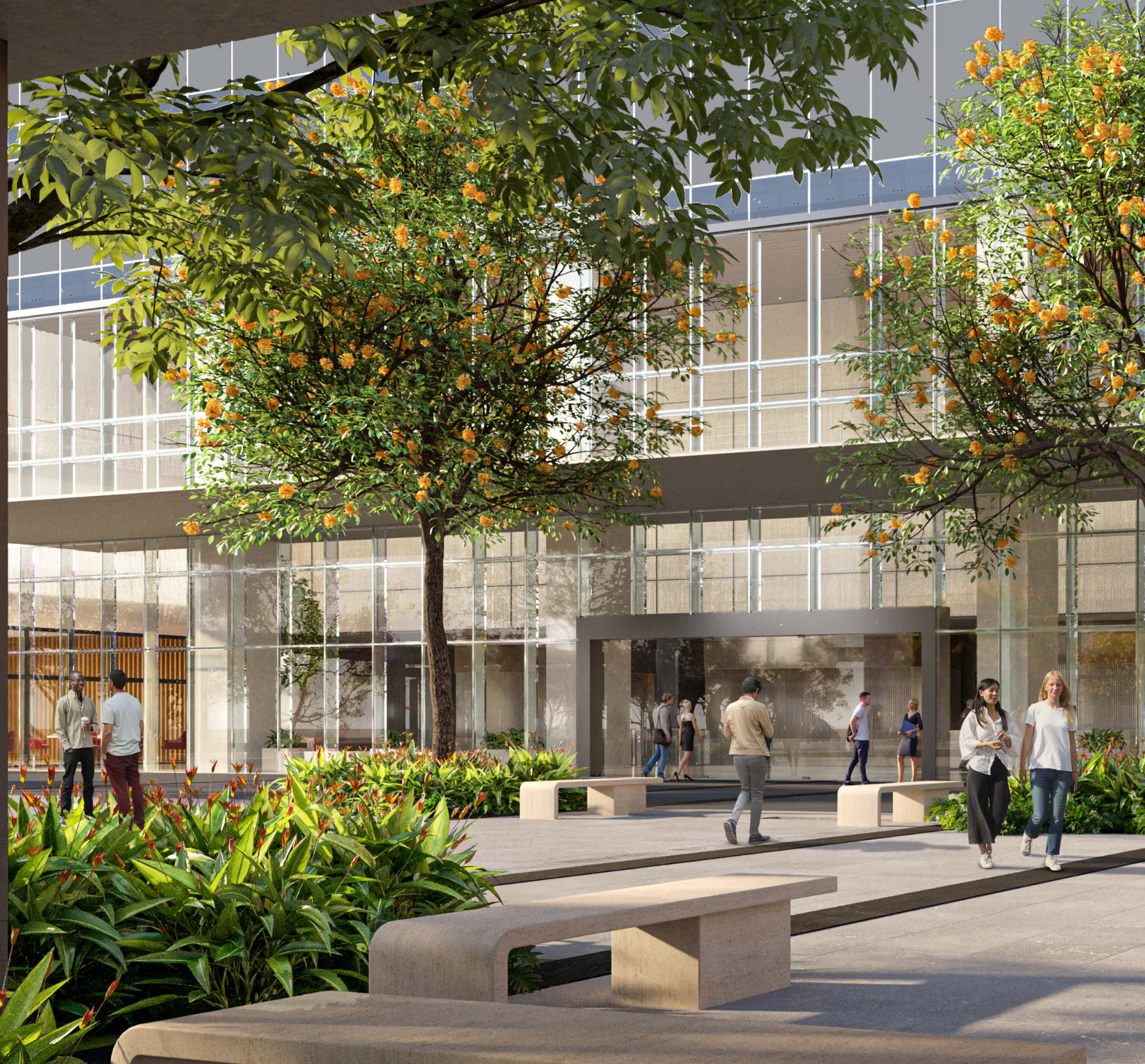 - Landscape plaza with interspersed seating for relaxed retail experience