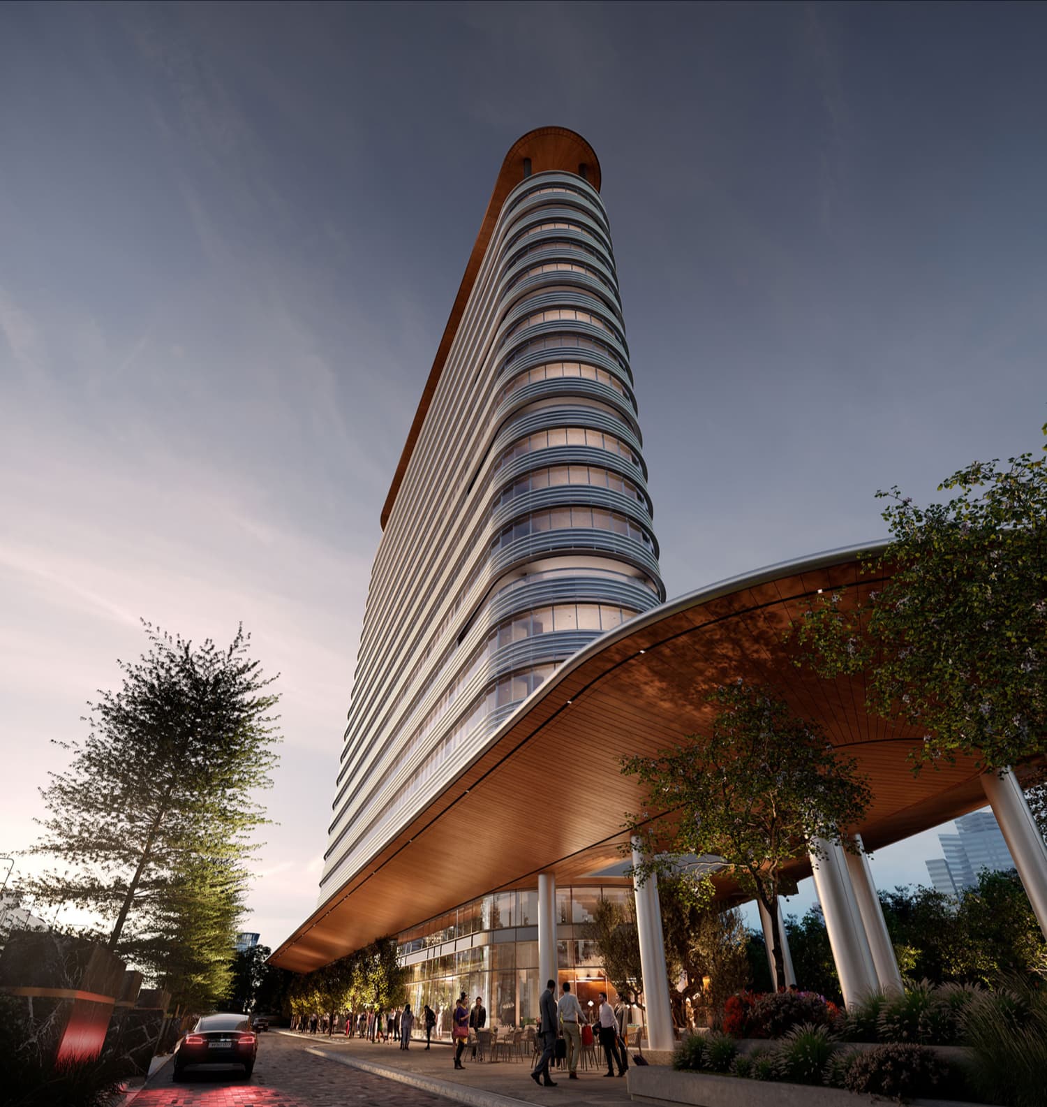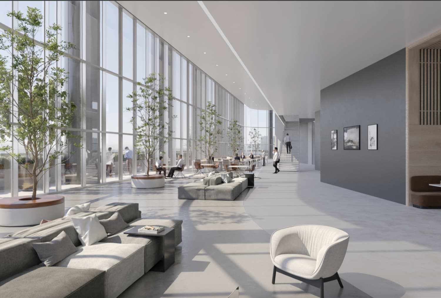 Inside, the lobby balances elegance with function—seamless technology meets collaborative spaces and public art, creating an environment that feels both sophisticated and human.