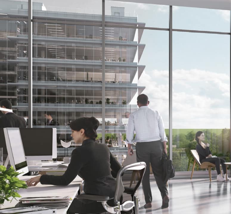 Column-free floorplates offer businesses the flexibility to shape their ideal work environment while thoughtfully integrated rooftop gardens, landscaped terraces and art installations foster collaboration and well-being.